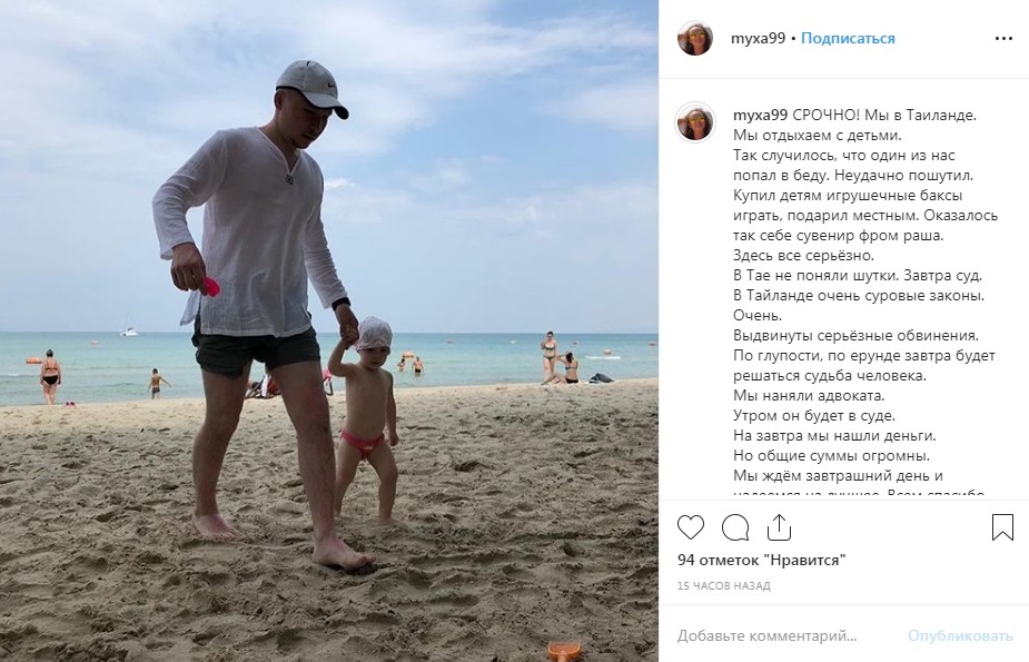 Вадима задержали, он второй день находится в одном из отделений туристической полиции Таиланда. Супруга Екатерина и друзья семьи срочно собирают деньги на оплату услуг адвоката, а также на оплату залога. Всего нужно собрать порядка миллиона рублей.