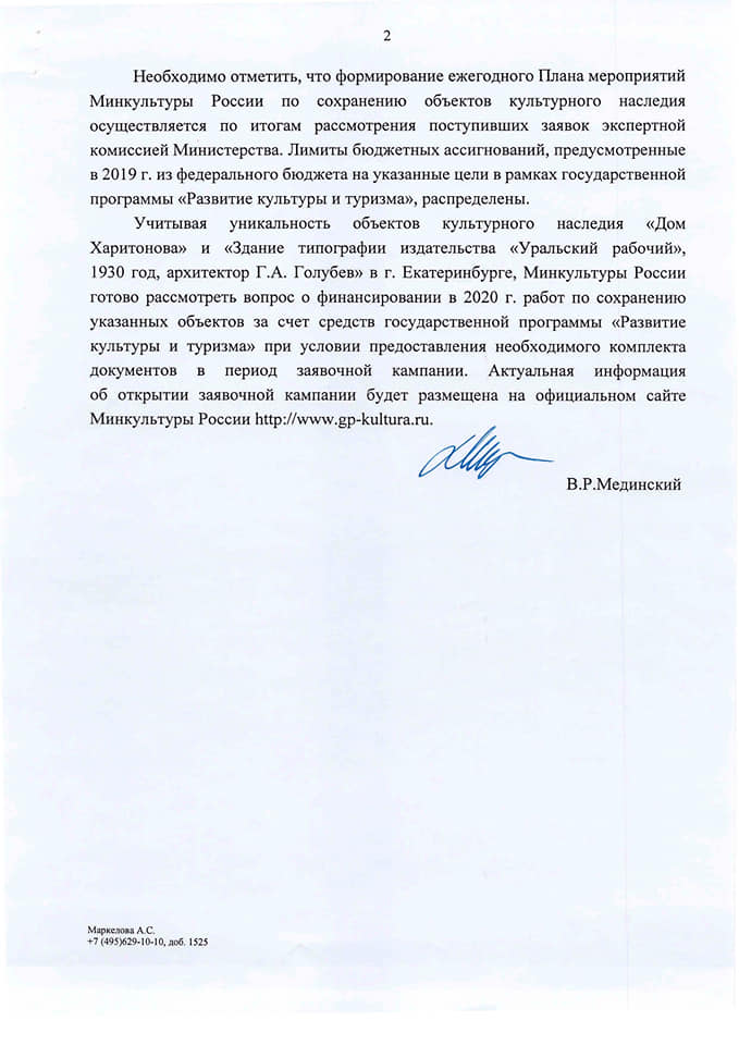 Министерство культуры РФ готово рассмотреть вопрос о финансировании ремонта сразу двух объектов культурного наследия в Екатеринбурге – бывшей усадьбы Харитоновых-Расторгуевых (Дворец пионеров) и типографии «Уральский рабочий».