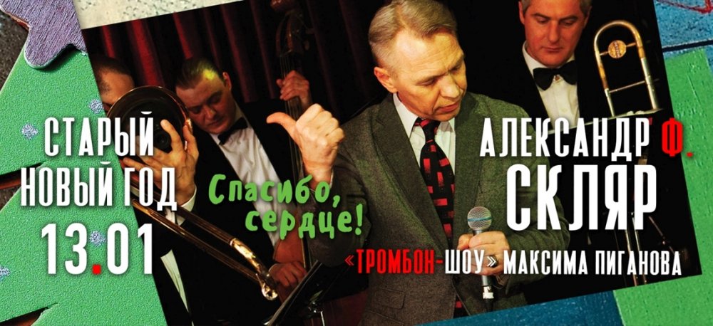 Праздничную программу представит 13 января в 18 часов в Филармонии Александр Ф. Скляр и джазовый ансамбль «Тромбон-шоу». Концерт будет посвящен 120-летию со дня рождения Леонида Утесова и, конечно, Старому Новому году.