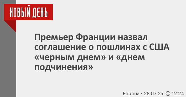 Премьер-министр Франции Франсуа Байру заявил через несколько часов после подписания соглашения между Европейским союзом и США о таможенных пошлинах, что это «черный день» для Европы, которая «смиряется с покорностью».