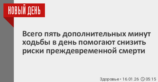 Всего 5 дополнительных минут ходьбы в день достаточно, чтобы получить пользу для здоровья и снизить риск преждевременной смерти.