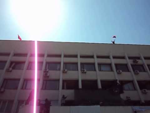 Эти данные подтверждает сайт «Новости Мариуполя»: «С флагштока возле городского совета был сброшен флаг Украины, который сегодня утром в 8.30 водрузили сторонники единой Украины». Над зданием были подняты красное знамя, флаги ДНР и России.