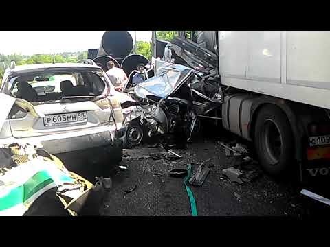Одну из легковых машин смяло между двумя тягачами, еще один автомобиль сплющило об отбойник, другой перевернулся на крышу, передает издание «ProГород 58». По словам очевидцев, первой зацепила проезжавший рядом автомобиль одна из фур, перевозившая трубы, вероятно, у грузовика отказали тормоза, или водитель уснул за рулем.