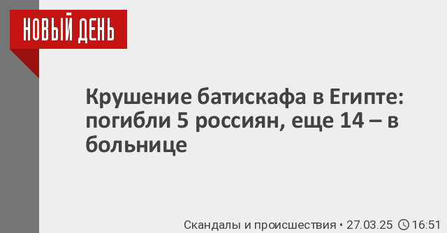 В Хургаде в результате крушения прогулочного батискафа погибли пять граждан России, еще 14 оказались в больнице. Такие данные приводит РИА «Новости» со ссылкой на источник в управлении скорой помощи Египта.