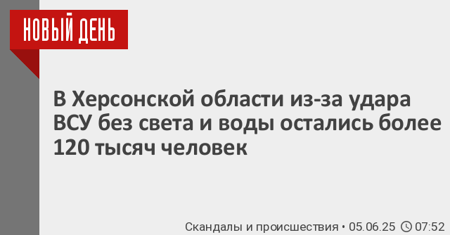 В результате украинского обстрела обесточена подстанция «Новотроицкое» в Херсонской области. Без электроснабжения остались 192 населенных пункта в семи муниципальных округах – свыше 120 тысяч человек. Об этом сообщил губернатор региона Владимир Сальдо в своем телеграм-канале. У жителей также нет в домах воды.