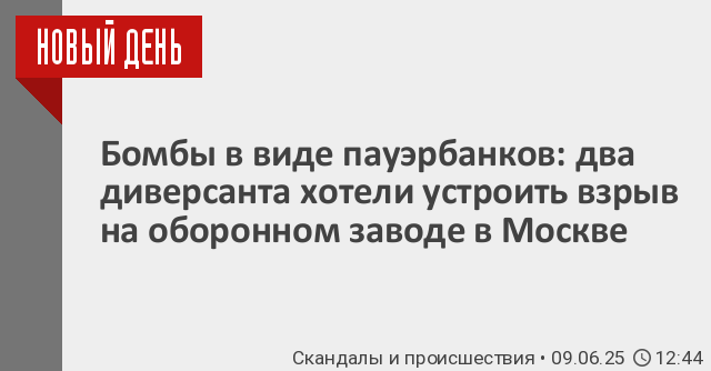 ФСБ заявила о задержании и аресте двух граждан России, планировавших совершить диверсию на одном из предприятий оборонно-промышленного комплекса в Московском регионе. Мужчин задержали в момент проноса самодельных взрывных устройств на территорию предприятия.