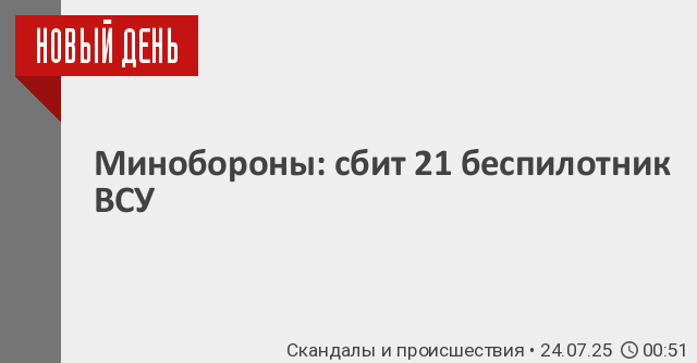 «23 июля с 20:40 мск до 23:50 мск дежурными средствами ПВО уничтожен и перехвачен 21 украинский беспилотный летательный аппарат самолетного типа: 10 – над акваторией Черного моря, 9 – над акваторией Азовского моря и 2 – над территорией Краснодарского края», – сообщила пресс-служба Минобороны.