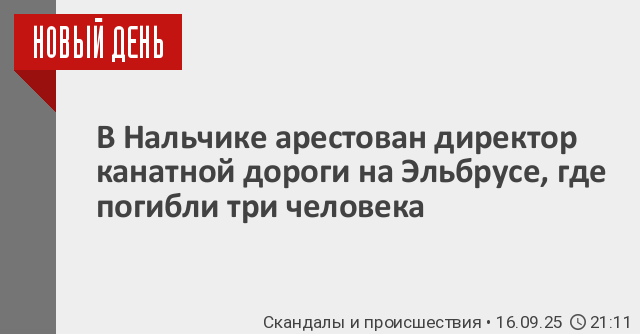 Обрыв на однокресельной канатной дороге на Эльбрусе произошел днем 12 сентября. В результате ЧП погибли три человека и девять получили травмы. По данному факту было возбуждено уголовное дело по ч.3 ст.238 УК РФ (оказание услуг, не отвечающих требованиям безопасности жизни и здоровья потребителей, повлекших по неосторожности гибель дух лиц). Глава КБР Казбек Коков назвал предварительной причиной аварии сход троса с ролика одной из опор.