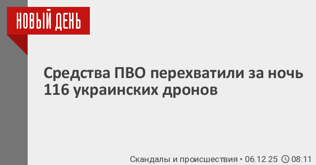 «В течение прошедшей ночи дежурными средствами ПВО перехвачены и уничтожены 116 украинских беспилотных летательных аппаратов самолетного типа», – говорится в сообщении оборонного ведомства.