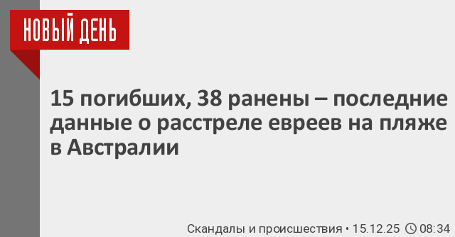 15 человек погибло, 38 находятся в больнице – таковы последние данные по стрельбе на пляже Бонди в Австралии. Напомним, накануне два человека – отец и сын – вооружились винтовками и пошли на пляж, где собрались евреи, чтобы отметить первый день Хануки. Среди госпитализированных – случайный прохожий, который пытался обезвредить одного вооруженного нападавшего.