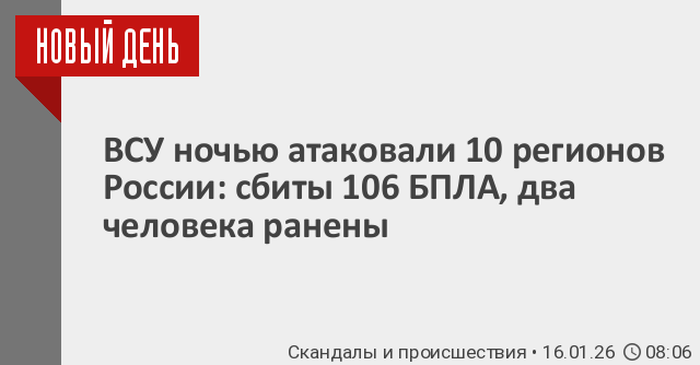 Прошедшей ночью средства противоздушной обороны уничтожили 106 украинских беспилотников над десятью российскими регионами. Об этом сообщает Минобороны РФ. Основной удар БПЛА пришелся на Белгородскую и Рязанскую области, где перехвачено соответственно 44 и 22 дрона. Не обошлось не пострадавших – в Рязанской области медпомощь оказана двум мирным жителям.