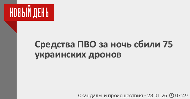 «В течение прошедшей ночи дежурными средствами ПВО перехвачены и уничтожены 75 украинских беспилотных летательных аппаратов самолетного типа», – говорится в сообщении.