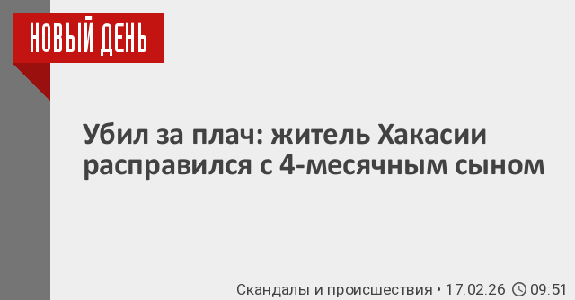 В Хакасии 27-летний мужчина несколько раз ударил четырехмесячного сына по голове, когда тот начал плакать. Ребенок от полученных травм скончался. Отца задержали. Возбуждено уголовное дело. Об этом сообщает следственное управление СК РФ по Красноярскому краю и Республике Хакасия.