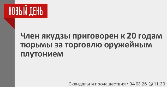 Член японской организованной преступной группировки якудза был приговорен во вторник в Нью-Йорке к 20 годам тюремного заключения за международную торговлю ядерными материалами, наркотиками и оружием, сообщили американские судебные власти. «Такеши Эбисава был привлечен к ответственности за свои преступления, включая попытку продать оружейный плутоний Ирану и наводнить Нью-Йорк смертельно опасными наркотиками», – говорится в заявлении Джона Эйзенберга из отдела национальной безопасности Министерства юстиции США.
