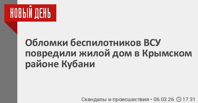 В двух поселениях Крымского района Краснодарского края подтвердили падение обломков беспилотников после ночной атаки со стороны вооруженных формирований Украины. Об этом сообщает оператиный штаб региона.