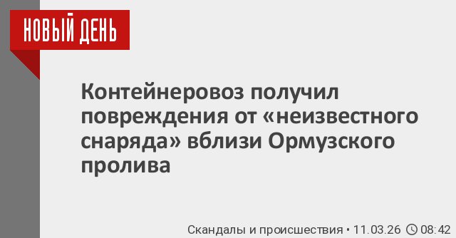 Британское морское агентство (UKMTO) сообщило в среду, что контейнеровоз получил повреждения от «неизвестного снаряда» у берегов Объединенных Арабских Эмиратов, недалеко от Ормузского пролива.