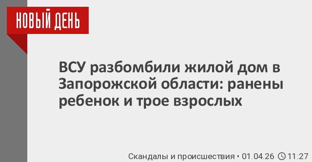 В городе Васильевка Запорожской области четыре человека, в том числе трехлетний ребенок, пострадали в результате ночного удара ВСУ по двухэтажному жилому дому. Об этом сообщил глава региона Евгений Балицкий.