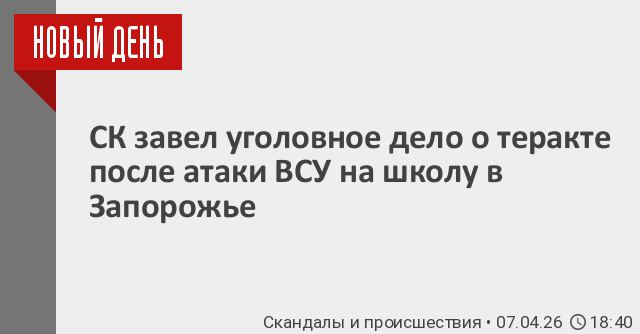 Следственный комитет (СК) России возбудил уголовное дело о теракте после удара Вооруженных сил Украины по общеобразовательной школе в селе Великая Знаменка Каменско-Днепровского района Запорожской области, в результате которой один человек погиб и еще несколько, включая детей, пострадали.