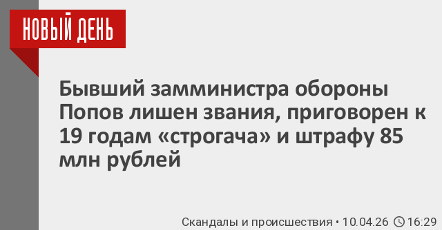 Военный суд приговорил бывшего заместителя министра обороны РФ Павла Попова, который обвинялся в коррупции, в том числе во взяточничестве и должностных преступлениях, к 19 годам годам колонии строгого режима и крупному штрафу – 85 млн рублей.