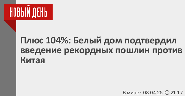 Сегодня вечером американские СМИ сообщили, что пошлины США на импорт из Китая достигнут отметки в 104%. Канал CNBC, публикацию которого цитирует «Интерфакс», отмечает, что США были готовы пересмотреть свою позицию, если бы Китай отказался от ответных пошлин на американские товары. Однако в Пекине заявляли, что не собираются идти на уступки.