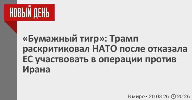 Североатлантический альянс является «бумажным тигром» после отказа европейских союзников присоединиться к потенциальной военной операции США в Ормузском проливе против Ирана. Об этом заявил президент США Дональд Трамп в своей социальной сети.