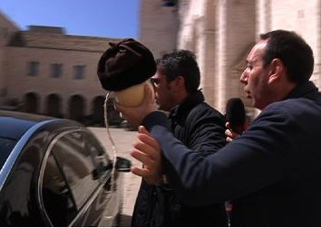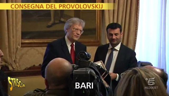 «Спецкор» итальянской сатирической программы «По следам события» Минго предпринимает первую неудачную попытку вручить российскому послу «Премию Обещалкина»
