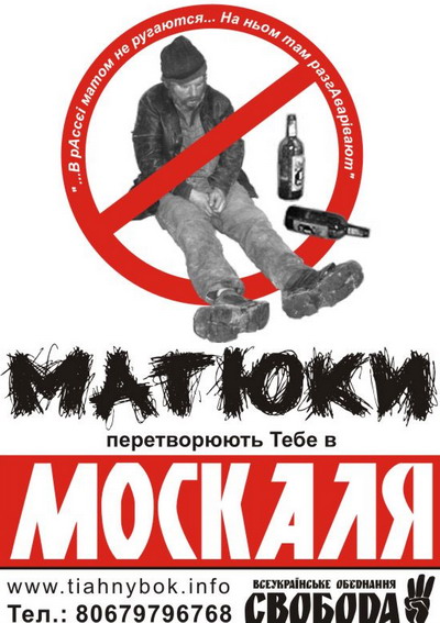 По Львову распространяются наклейки с надписями «Их матюки обложили наши языки» и «В России матом не ругаются, на нем там разговаривают». На наклейках образ жителя России представляет бородатый мужик с бутылкой