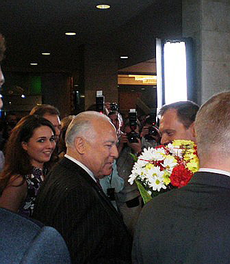 Неожиданно прессу потеснили широкоплечие молодчики в дорогих костюмах, расчистив проход для «випов». В зале появился экс-президент Украины Леонид Кучма с супругой Людмилой. Они быстро поздравили посла, Кучма поцеловал внучку, а затем в скором темпе чета удалилась в отдельный зал, чтобы быть подальше от прессы.