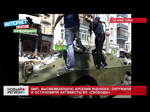 Тут же несколько смельчаков взобрались на броню и стали демонстрировать флаг «Свободы», а в ствол БМП была вставлена полиэтиленовая бутылка.
