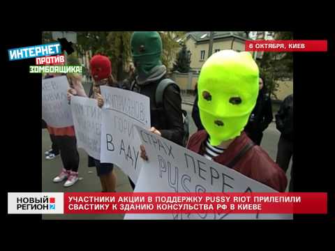 Украинские левые считают условия содержания Надежды Толоконниковой и Марии Алёхиной в тюрьме нечеловеческими, а потому обвиняют российские власти в фашизме. Свастику помимо здания консульства манифестанты также разместили на портрете Владимира Путина.