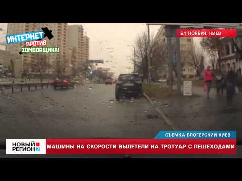 На видеохостинге Youtube появилась запись шокирующей аварии, которая произошла в среду на Краснозвездном проспекте в Киеве: две иномарки на высокой скорости вылетели с проезжей части на тротуар, где находились прохожие.