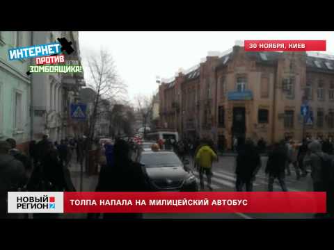 Киев, Ноябрь 30 (Новый Регион, Михаил Рябов) – В центре Киева на улице Михайловской толпа напала на милицейский автобус с затемненными окнами, который проехал мимо участников митинга на Михайловской площади.