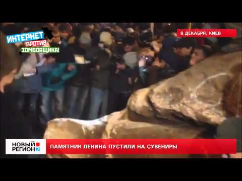 В эти минуты в Киеве у Бессарабского рынка участники Евромайдана кувалдами на куски разносят памятник Ленину, который сегодня вечером был сброшен с постамента.