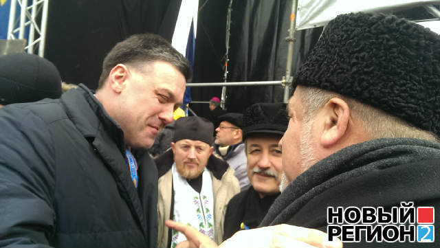 Олег Тягнибок приветствует Рефата Чубарова за сценой Евромайдана