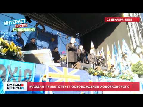 Участники митинга на Майдане Независимости в центре Киева приветствовали освобождение российского бизнесмена и политического деятеля Михаила Ходорковского из тюрьмы, где он провел около 10 лет.