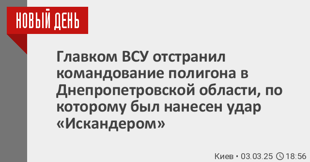 Главнокомандующий ВСУ Александр Сырский отстранил от выполнения служебных командование полигона Новомосковский в Днепропетровской области, который подвергся удару российской баллистической ракеты «Искандер».