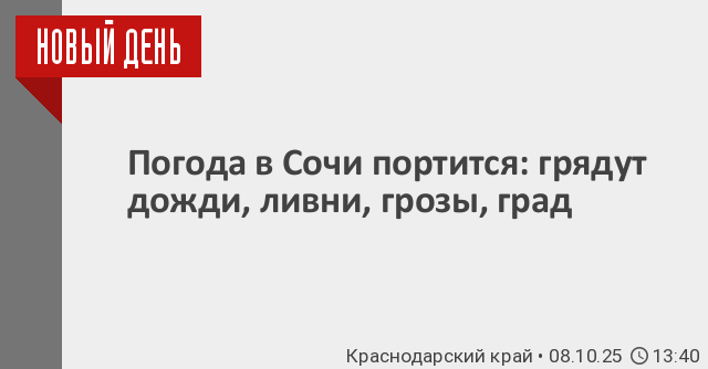 По сообщению метеорологов, утром, днем и до конца суток 9 октября, а также в течение суток 10 и 11 октября на территории Сочи и ФТ Сириус ожидается целый комплекс неблагоприятных гидрометеорологических явлений. Речь идет о сильных дождях и ливнях в сочетании с грозой, местами будет идти град, ожидается также шквалистое усиление ветра до 20-25 м/с. Местами метеорологи прогнозируют сильные ливни и очень сильный дождь.