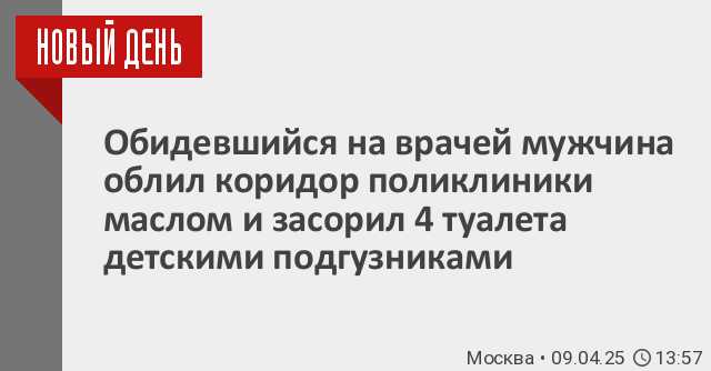 15 суток за мелкое хулиганство дал Тимирязевский суд жителю Москвы. Как следует из материалов дела, обвиняемый пришел в травматологию в поликлинику, однако, по его словам, помощи там не получил. Обидевшись, мужчина взял и разлил растительное масло на лестнице и перилах травматологического отделения, а также забил четыре туалета детскими подгузниками.