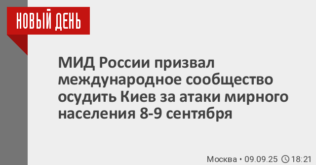 Официальный представитель МИД России Мария Захарова выступила с призывом к международному сообществу осудить удары Киева по мирному населению 8-9 сентября, когда Донецк отмечал 82-ю годовщину освобождения города от немецко-фашистских захватчиков в ходе Донбасской наступательной операции 1943 года.