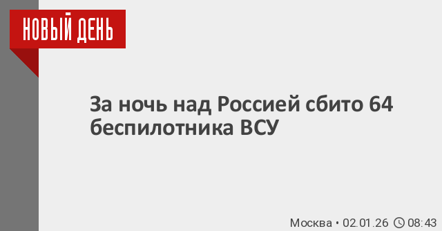 64 беспилотника самолетного типа были перехвачены над территорией России силами ПВО. Как сообщает Минобороны страны, налеты отражались в период с 23:00 1 января до 7 утра 2 января по московскому времени.