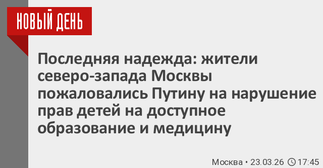 «Уважаемый Владимир Владимирович! К вам обращаются жители района Митино, улица Муравская. В нашем молодом микрорайоне введены в эксплуатацию 10 тысяч квартир. Проживают около 4 тысяч детей, в том числе инвалиды и дети с ограничения возможности здоровья. Но в шаговой доступности нет ни одной бюджетной школы, детского сада и поликлиники, добираться до них утром мы вынуждены более 40 минут», – отметили москвичи.