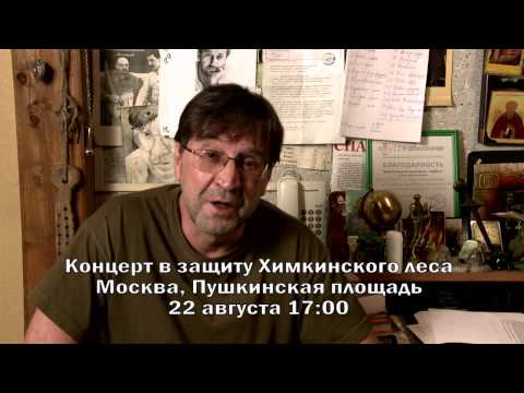 «Как все теперь уже знают, я Юра Шевчук, музыкант. Приглашаю всех на митинг-концерт на Пушкинской площади, который будет посвящен спасению наших лесов, полей и гор, и, конечно же, небес», – заявляет Шевчук. Он отмечает, что Химкинский лес – это метафора, и сейчас он «олицетворяет борьбу простых граждан с бюрократией, геноцид которой мы все на себе чувствуем».