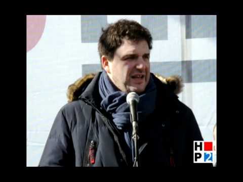 Выступил журналист и организатор митинга Сергей Пархоменко. Он говорил о политических заключенных, наличие которых категорически отвергает Владимир Путин.