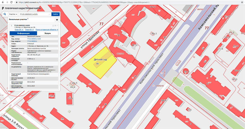 На улице Ефремова, 9 «А» в Хамовниках, согласно открытым источникам, когда-то находился детский сад Минобороны №270. Здание было заброшено и много лет не использовалось, однако на публичной кадастровой карте Росреестра оно до сих пор значится, как детсад. Земельный участок под ним под номером 77:01:0005011:4105 поставлен на учет в сентябре 2013 года, однако сведения о нем были изменены 9 января 2019-го. Теперь земля с кадастровой стоимостью свыше 381 млн рублей может быть использована под размещение офисных зданий делового и коммерческого назначения, а вовсе не под объекты образования и просвещения, как было прежде.
