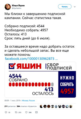 Примерно по такому же сценарию собирал подписи в 45-м округе Илья Яшин – очень мало и очень долго. Но за восемь последних дней он чудом собрал более двух тысяч подписей.