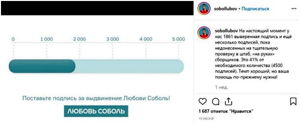 В частности, как пишет Nation-news.ru, юрист так называемого «Фонда борьбы с коррупцией» Любовь Соболь в первую неделю смогла собрать 500 голосов. В качестве оправдания она выдвинула версию, что дачный сезон в самом разгаре, и москвичи разъехались отдыхать. Тем неожиданней было сообщение, которое указывало на то, что Соболь за несколько дней собрала пару тысяч подписей.