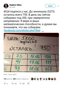 В 35-м избирательном округе к услугам «чуда» прибегнул и Владимир Милов. К 22 июня он смог наскрести всего лишь две тысячи подписей. Зато за последнюю неделю все остальные. Сейчас соратник Навального хвастается получением более 4,5 тысячи автографов избирателей.