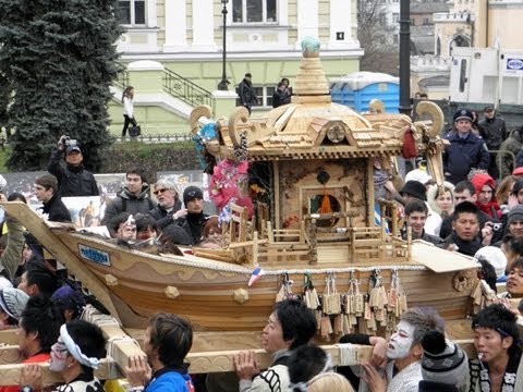 Во время исполнения танца поТеатральной площади среди зрителей пронесли деревянный кораблик микоси с прикрепленными деревянными дощечками, на которых все желающие могли написать пожелания японскому народу