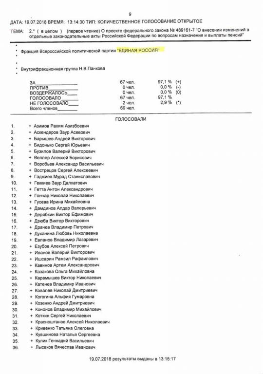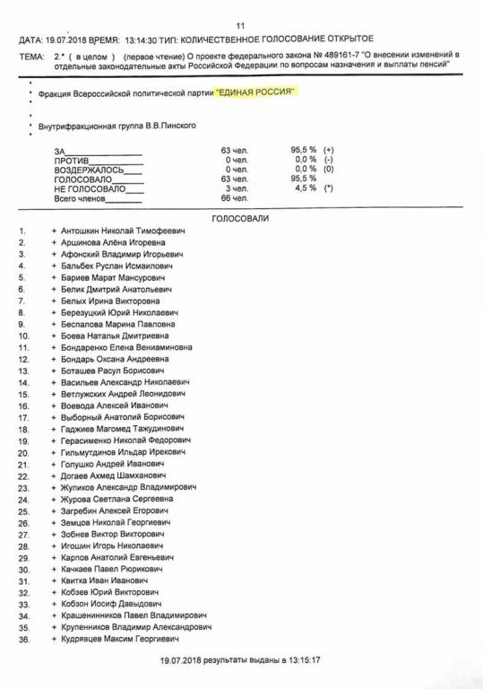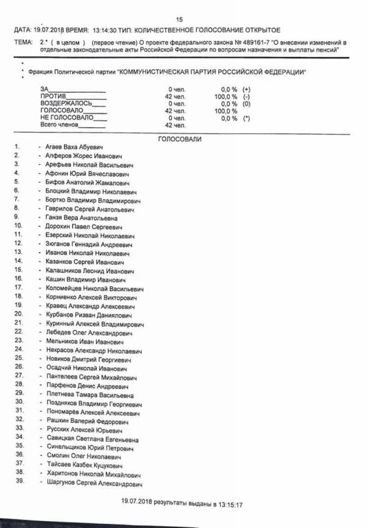 Отметим, что против пенсионной реформы проголосовали все 42 депутата от КПРФ, 22 – от «Справедливой России» (не голосовал Вадим Белоусов), 37 – от ЛДПР (не голосовал Юрий Волков). «Новый День» публикует соответствующие поименнные списки парламентариев, попавшие в распоряжение агентства.