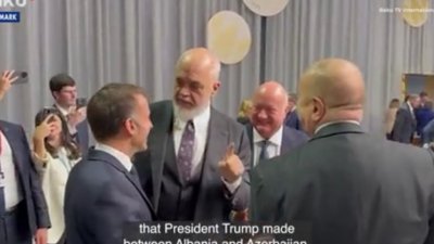 Премьер-министр Албании Эди Рама в притворной ярости подбежал к Макрону и сказал: «Вы должны извиниться… перед нами, потому что вы не поздравили нас с мирным соглашением, которое президент Трамп заключил между Албанией и Азербайджаном».